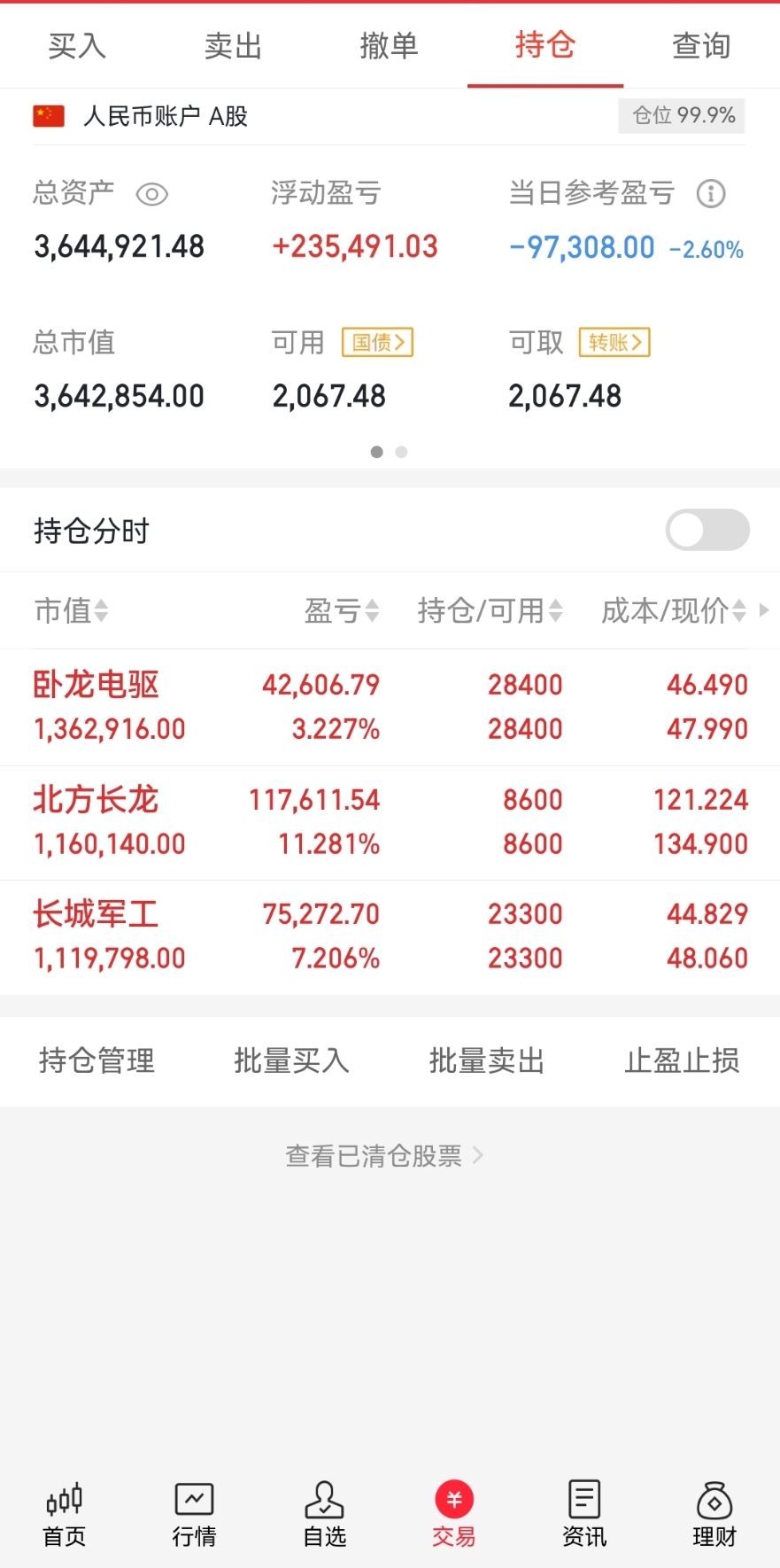 今天仓位还是$长城军工(SH601606)$ ,$北方长龙(SZ301357)$ ,$卧龙电驱(SH600580)$