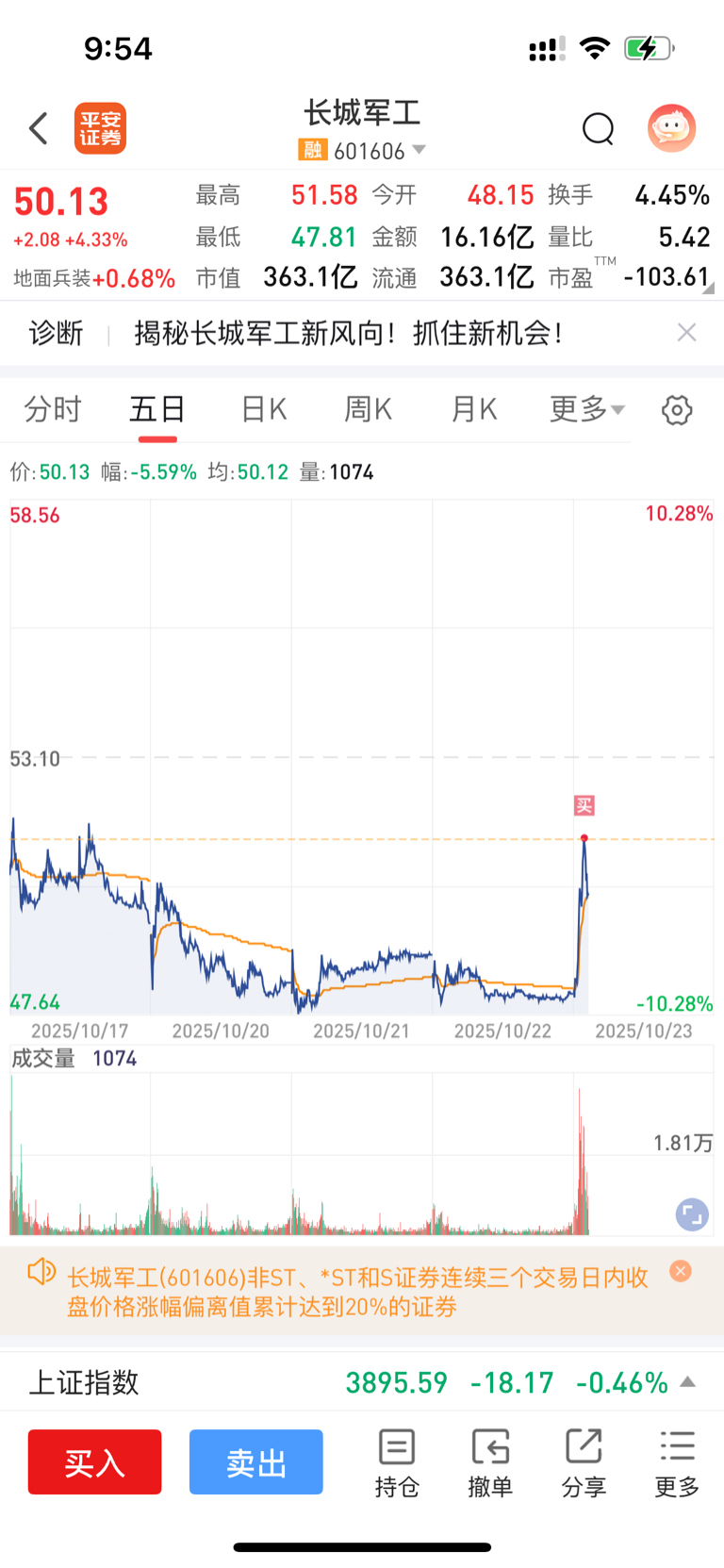 $长城军工(SH601606)$ 对自己无语到了极致