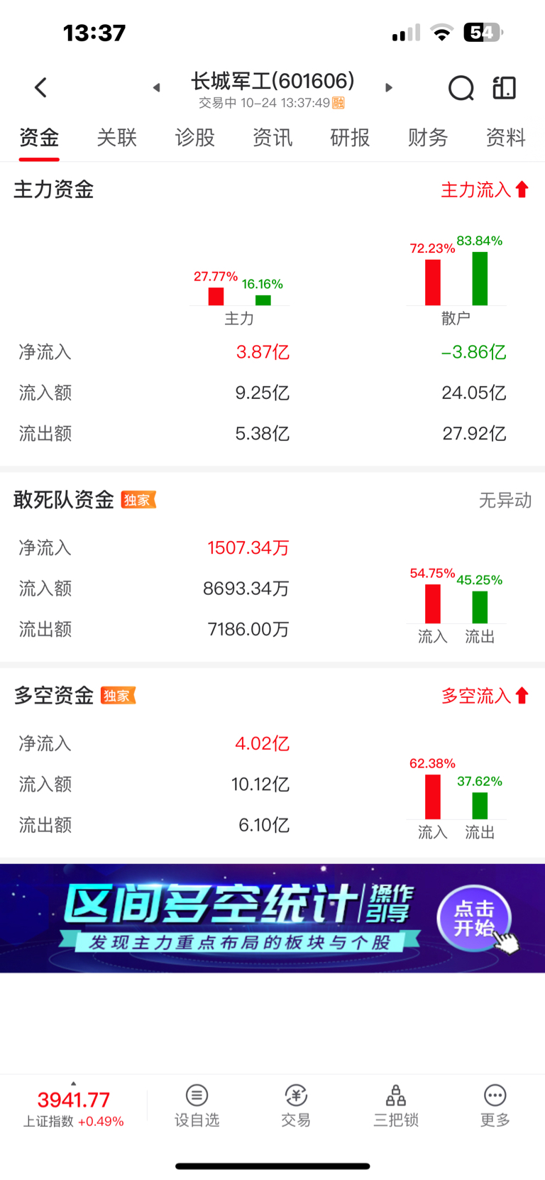 $长城军工(SH601606)$ 主力多空资金流入这么多来个涨停