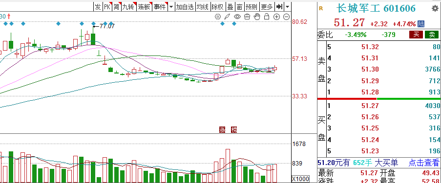 前面也做过一次,今天再度看好,再度入手也再度达到预期,所以很多时候盯着一只票来回布局也是不错的选择。这家公司主营军品和民品,核心产品是预应力钢绞线锚固产品,还拥有5家国家高新技术企业、多个省级技术 / 工程中心及博士后科研工作站,常与高校、科研院所搞产学研合作。它另一大业务是弹Y装备研发生产,产品涵盖迫击炮弹、单兵火箭等,掌握多项核心技术,在多个领域处于国内领先,部分单兵火箭性能达国际先进;还涉足新能源汽车空调压缩机业务,客户包括河南德力新能源汽车等。今年年初,公司接间接控股股东兵器装备集团通知,其正与其他国资央企筹划重组,可能导致公司控股股东变更,但实控人不变。此前军工行情中,这票就是核心头部标的,辨识度高,不排除今后还会复制。技术面看,前期拉升带量说明有大单流入,近期下跌缩量说明流出有限,昨日上影线阳线是 “仙人指路” ,今天终于再度放阳,老鸭头结构趋势已经日发明朗,继续看反弹。