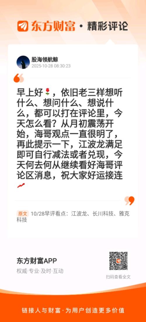 ,依旧老三样想听什么、想问什么、想说什么,都可以打在评论里,今天怎么看?从月初震荡开始,海哥观点一直很明了,再此提示一下,江波龙满足即可自行减法或者兑现,今天何去何从继续看好海哥评论区消息,祝大家好运接连