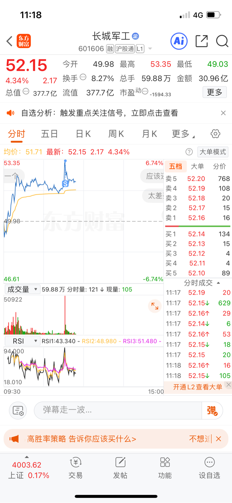 $长城军工(SH601606)$ 53.30毛走的,希望是对的