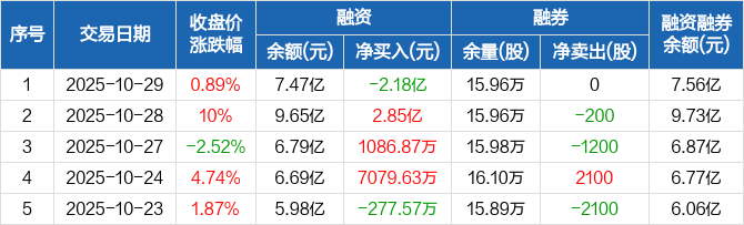 长城军工融资融券信息显示,2025年10月29日融资净偿还2.18亿元;融资余额7.47亿元,较前一日下降22.6%。