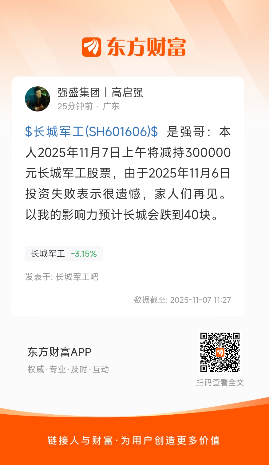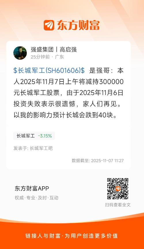 $长城军工(SH601606)$ 是强哥:本人2025年11月7日上午将减持300000元长城军工股票,由于2025年11月6日投资失败表示很遗憾,家人们再见。以我的影响力预计长城会跌到40块。