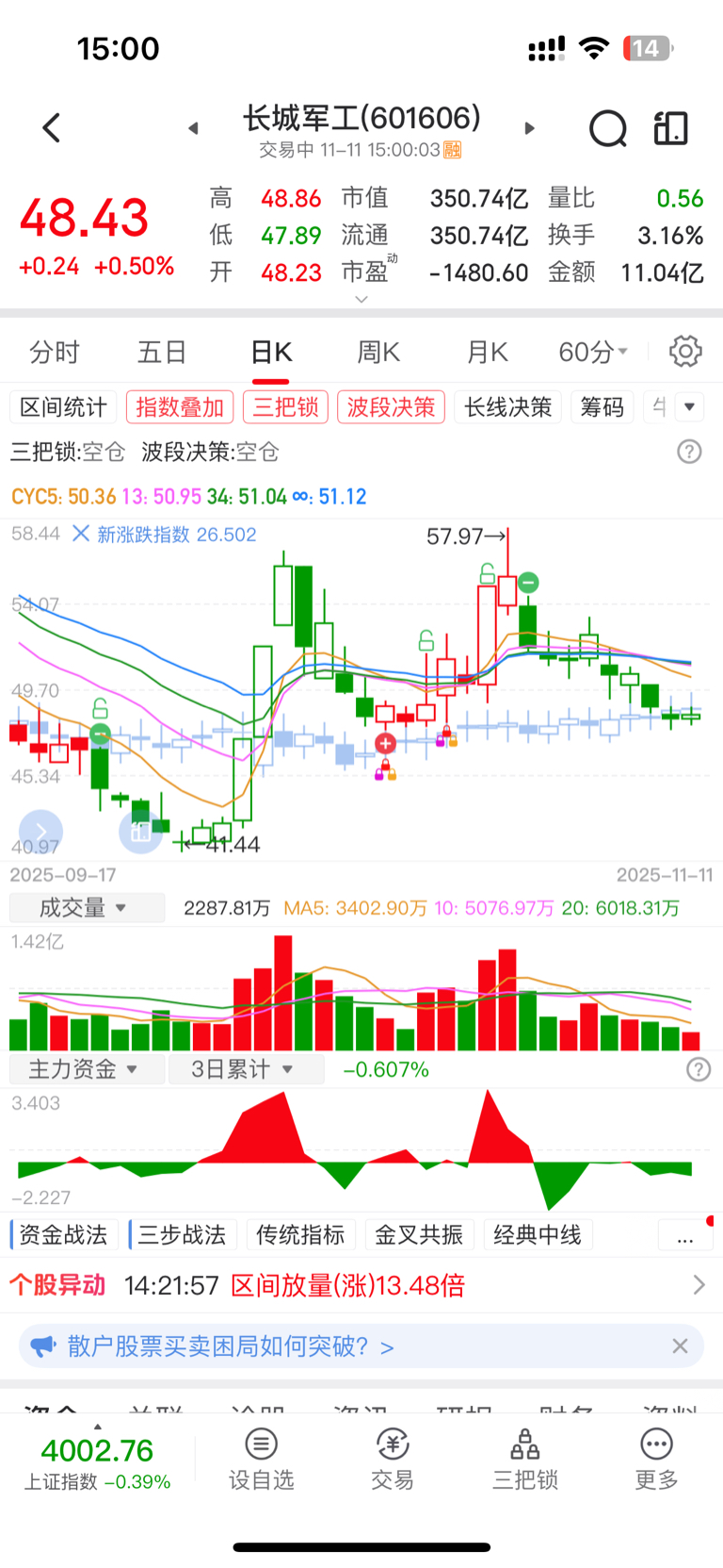 $长城军工(SH601606)$ 怎么还没出现买入信号啊?急死了,要不要买呢?