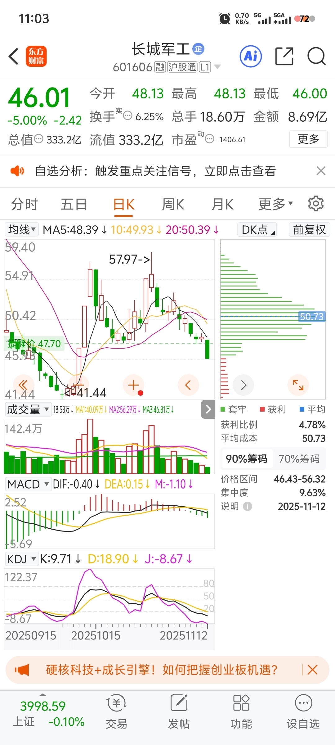$长城军工(SH601606)$ 跌破支撑位
