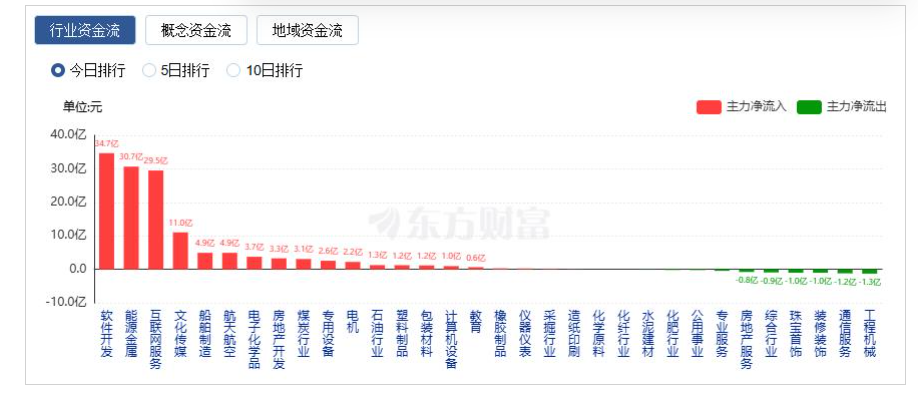 行业板块涨跌互现,能源金属、船舶制造、互联网服务、软件开发、煤炭行业涨幅居前,医药商业、贵金属、生物制品、保险、化学制药板块跌幅居前。锂矿概念股爆发,盛新锂能、融捷股份、大中矿业、中矿资源、雅化集团、国城矿业、金圆股份等多只股票涨停。福建板块延续强势,厦工股份10天5板,平潭发展、龙洲股份3连板。AI应用概念快速走强,三六零、浪潮软件、宣亚国际等多股涨停。军工板块表现活跃,航天发展2连板。下跌方面,医药概念集体下挫,舒泰神、济民健康等大跌。行业紫金方面,截至收盘,软件开发、能源金属、互联网服务等净流入排名靠前,其中软件开发净流入34.68亿。