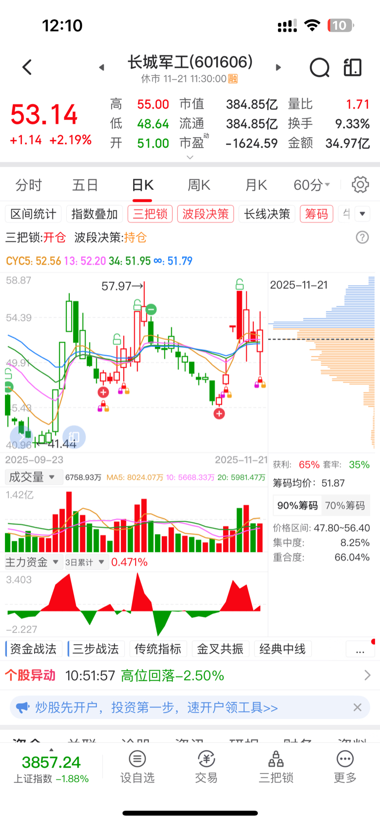 感谢长城不杀之恩,技术上波段继续持有,三把锁今天也开仓了,今天冲高卖了一些,但必