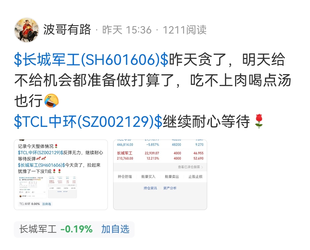 今天开盘翻红已经下车了,多少喝了点汤长城出来全部补