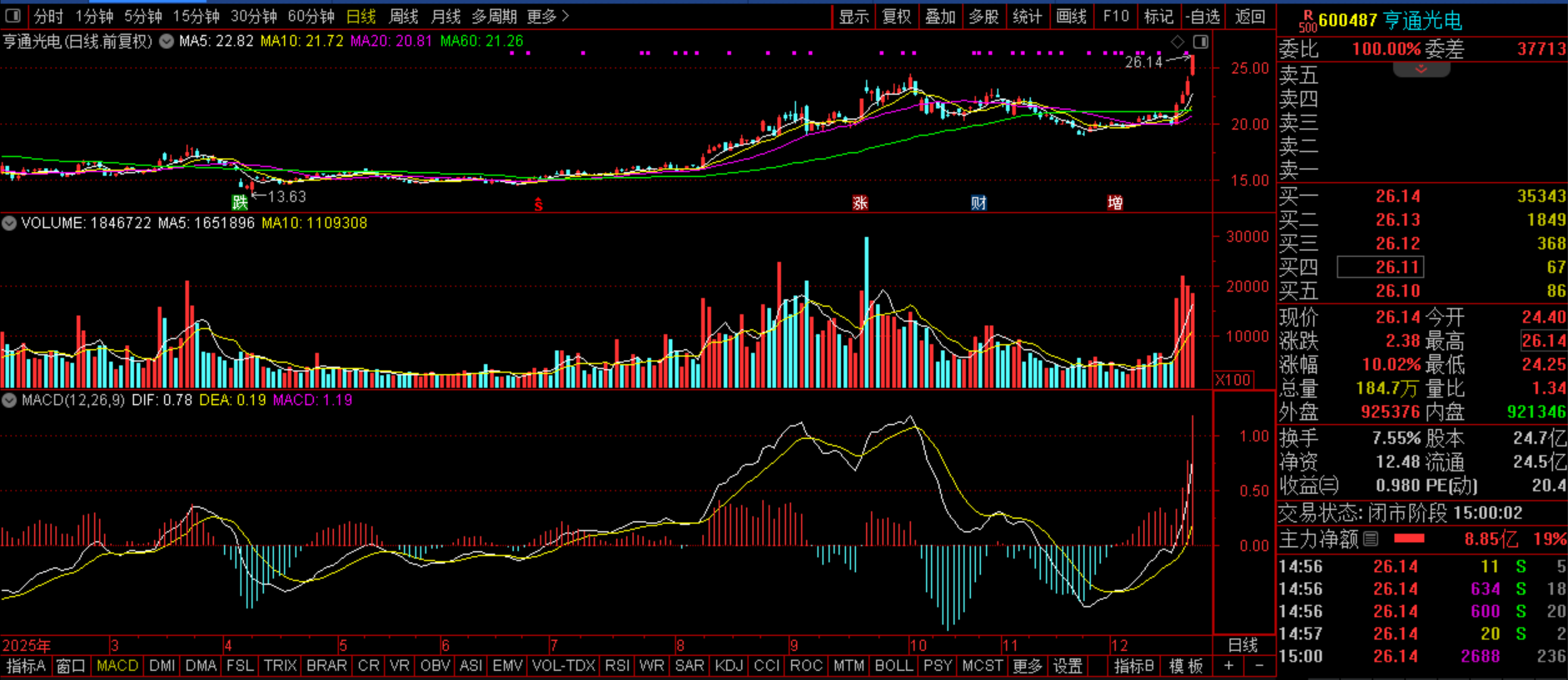 亨通光电(SZ600487):空芯光纤+人形机器人+海洋订单+海南本地股+CPO+海缆+算力中心。该股自从上周三突破60日线以来,连续放量上涨,并形成了上涨趋势,昨日再次拉涨封板,突破了近7年来的历史新高,这是突破行情,料后市新的上涨行情打开,后市或继续冲高甚至历史新高有望。预计今日有望继续拉涨,分歧走水的话,23.00稳住就依旧是安全的。