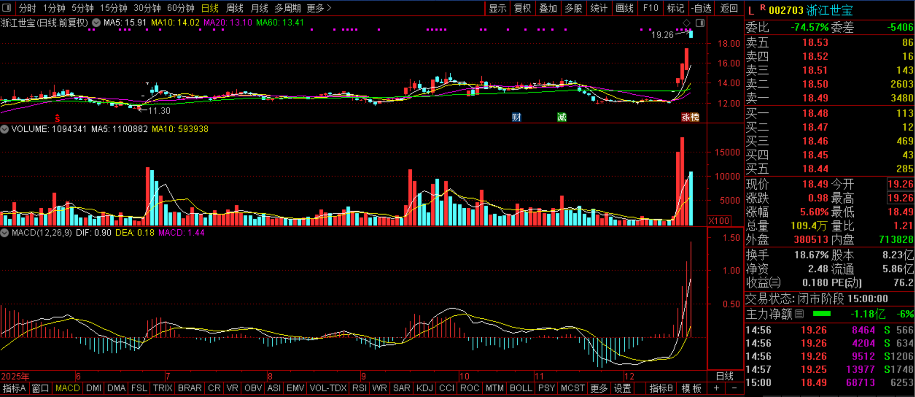 浙江世宝(SZ002703):L3自动驾驶+线控转向+智能转向+转向系统。昨日该股早盘一字板,之后虽有炸板,但很快再次封板,遗憾的是尾市收盘最后临盘阶段突然大单炸板,这是短线超调的信号,不过由于该股上涨趋势依旧,因此后市即便调整,看涨预期不变,还是继续看涨。预计今日此股有望强势分歧整理,如果地板的话,可能是机遇,值得大力研究。