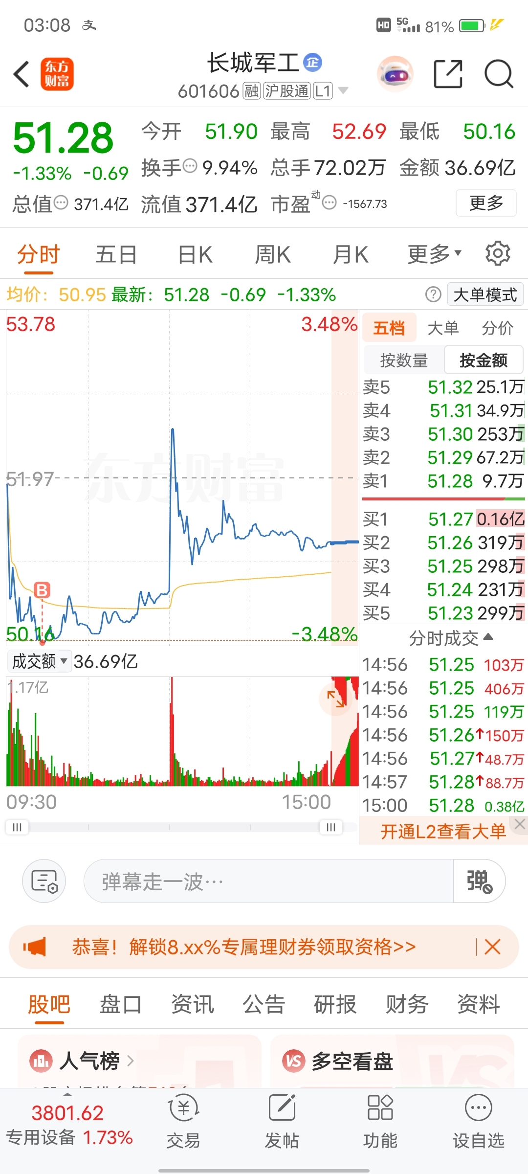 $长城军工(SH601606)$ 买的少 明天就想跑!!