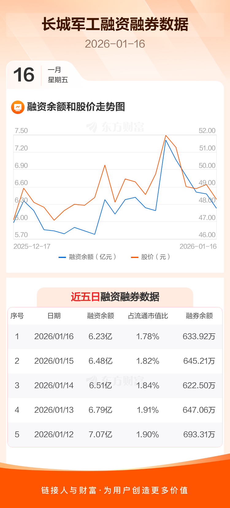 交易所最新数据显示,长城军工于2026年1月16日获融资买入5833.22万元,融资偿还8315.30万元,当日融资净偿还2482.08万元。目前,该股融资余额6.23亿,占流通市值比例为1.78%。
