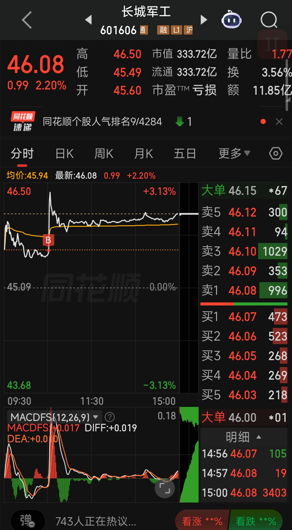 $长城军工(SH601606)$ 明天高开5~8个点。我买了半仓