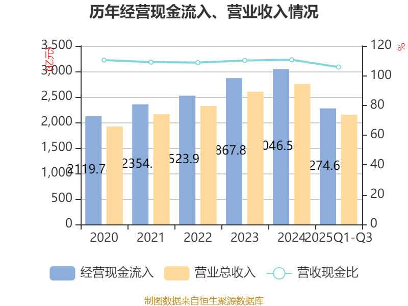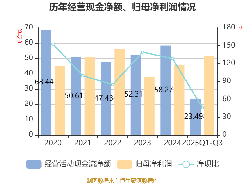 2025年前三季度,公司经营活动现金流净额为23.5亿元,同比下降15.56%;筹资活动现金流净额-5.54亿元,同比减少6.9亿元;投资活动现金流净额-7.9亿元,上年同期为3.58亿元。