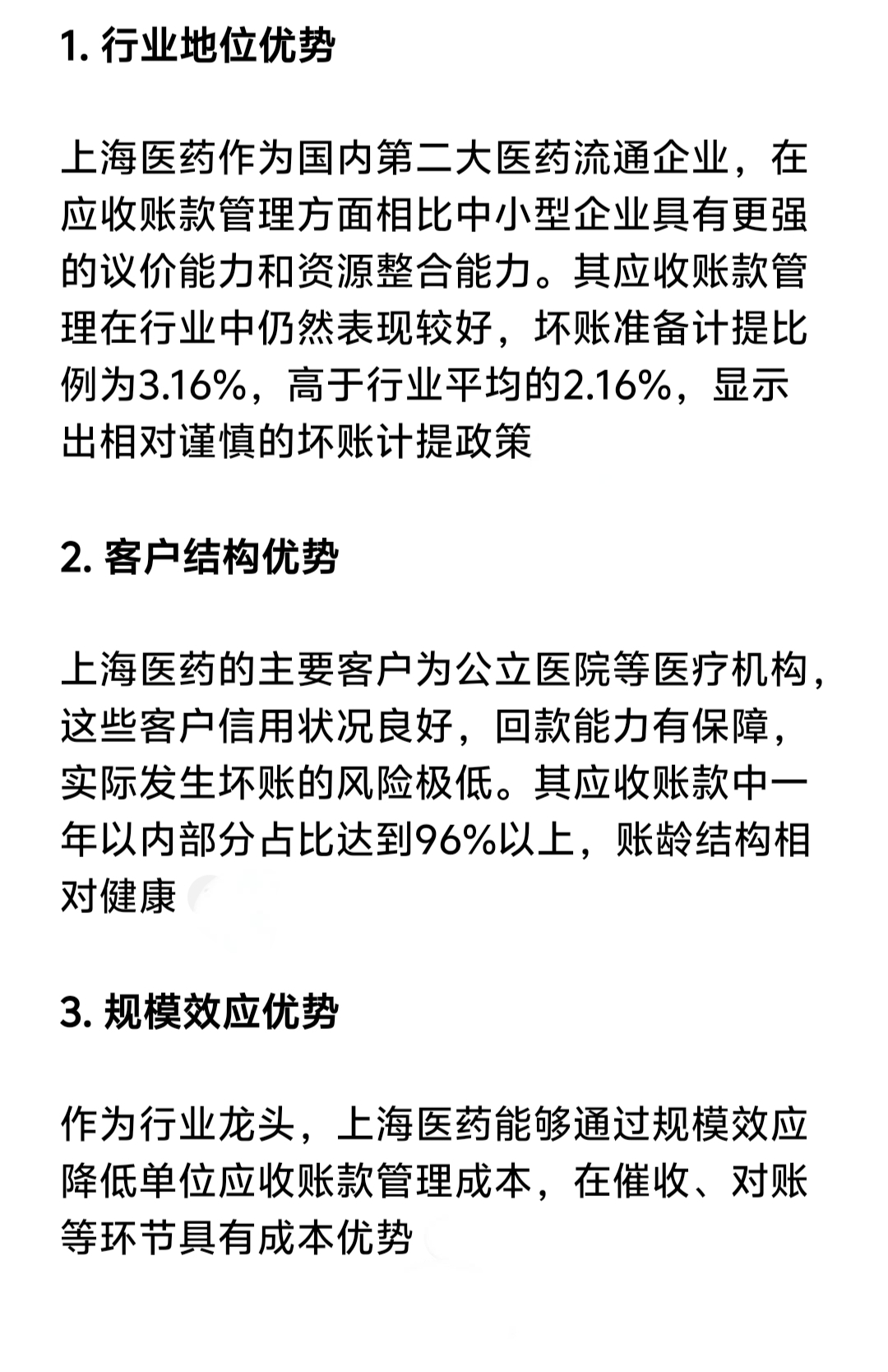 空狗们反复拿来唱空的应收款问题的解答。应收款高确实是个问题,但这是医药流通行业的特点,主要还是专注周转率和主要欠账群体,上海医药的周转率81天左右,属行业中等,欠账群体90%以上都是国有医药且96%的欠款都是1年期以内,计提做的也比较好,及时消化风险。这种国企,不会有系统性风险,别听那帮满肚子坏水的空狗瞎哔哔。它们无外乎想让持有者在低位割肉给它们的主子,同时吓退想在低位建仓的其他资金!