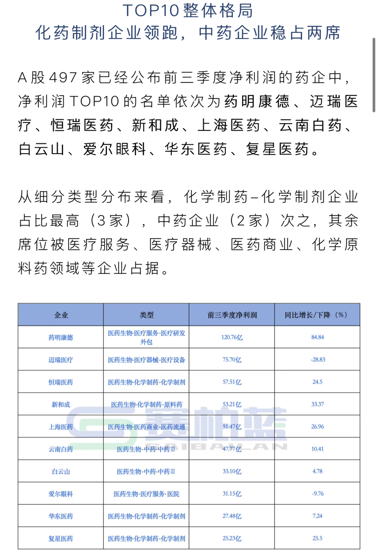 A股497家已经公布前三季度净利润的药企中,净利润TOP10的名单依次为药明康德、迈瑞医疗、恒瑞医药、新和成、上海医药、云南白药、白云山、爱尔眼科、华东医药、复星医药。