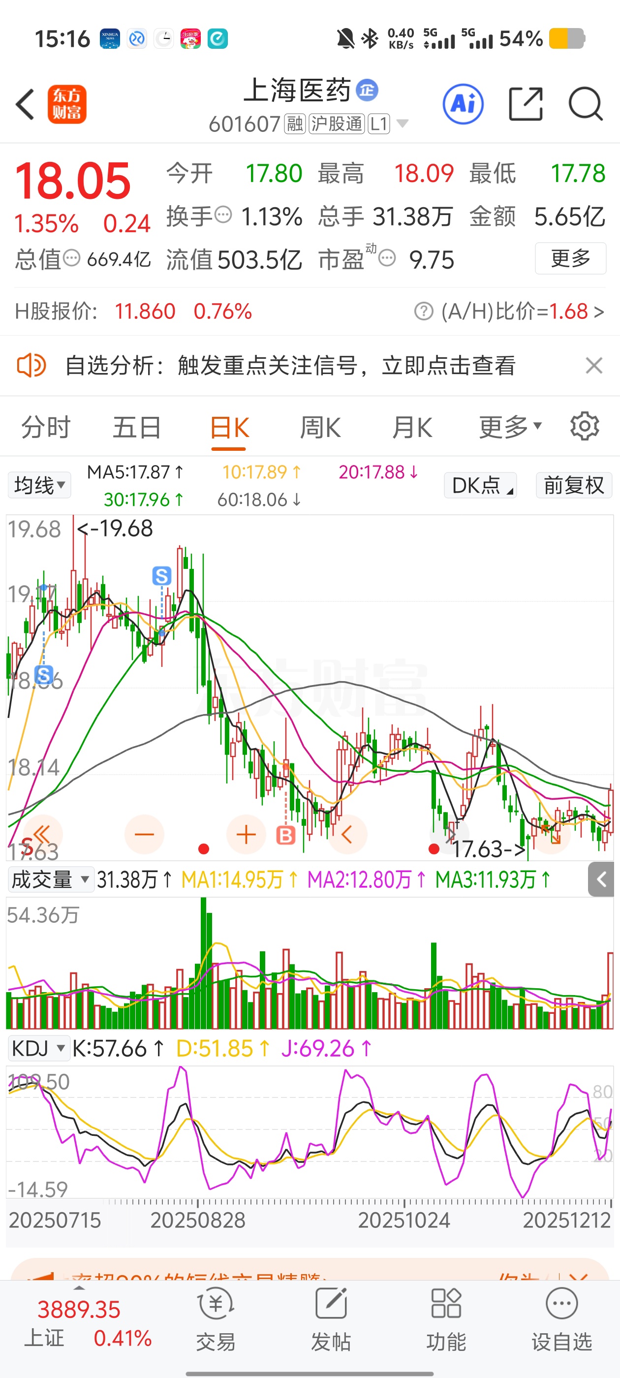 $上海医药(SH601607)$ 难得,医药商业到板块跌 1.35 个点,你却涨 1.35 点