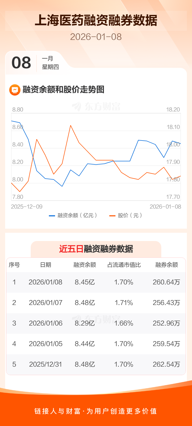 交易所最新数据显示,上海医药于2026年1月8日获融资买入2534.83万元,融资偿还2814.55万元,当日融资净偿还279.72万元。目前,该股融资余额8.45亿,占流通市值比例为1.70%。