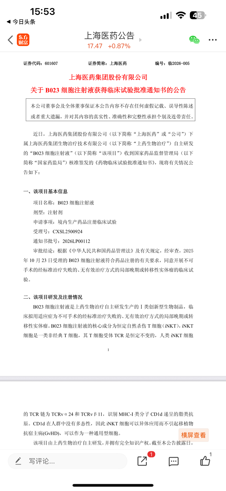 上海医药:你终于憋了一个超级大的。B023细胞注射液,主要应用于:晚期或转移实体