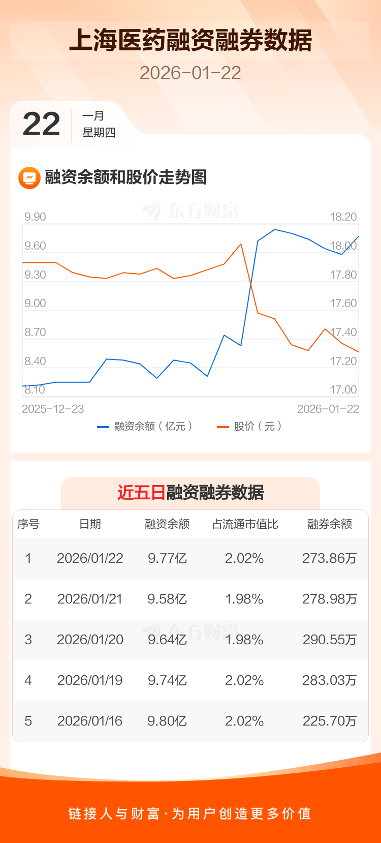 交易所最新数据显示,上海医药于2026年1月22日获融资买入4484.69万元,融资偿还2607.99万元,当日融资净买入1876.7万元。目前,该股融资余额9.77亿,占流通市值比例为2.02%。