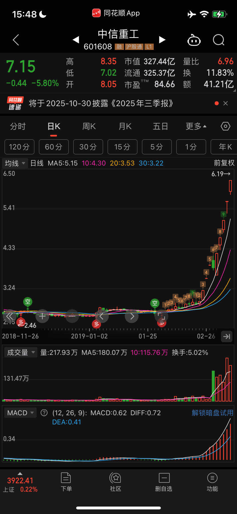 我来发一个中信重工历史上的走势和今天一模一样,你就能知道主力在干嘛,未来想干嘛