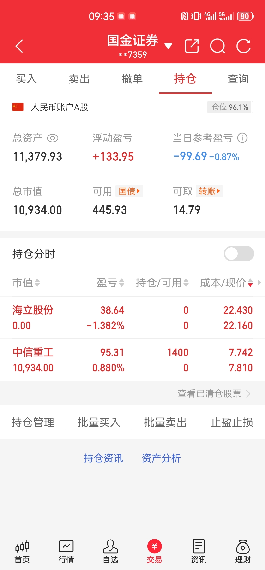 一万到一百万第九天,海立没有亏钱走了,-1买入中信重工