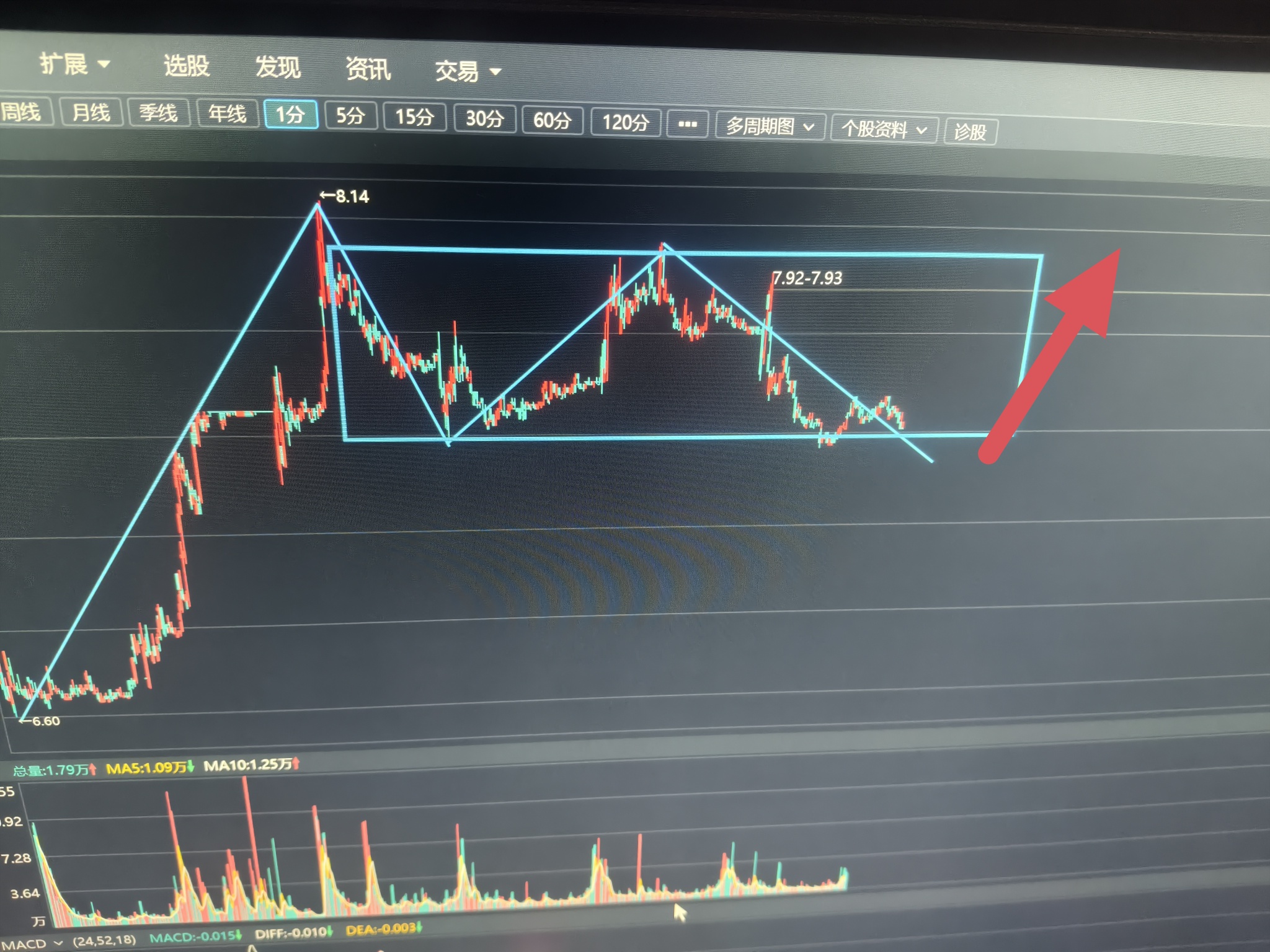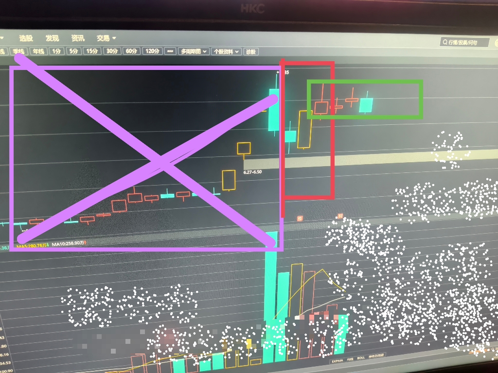 这么分析,无视紫色框。就是两根巨量大阳线后的缩量调整而已1f是这样表达的。后边的