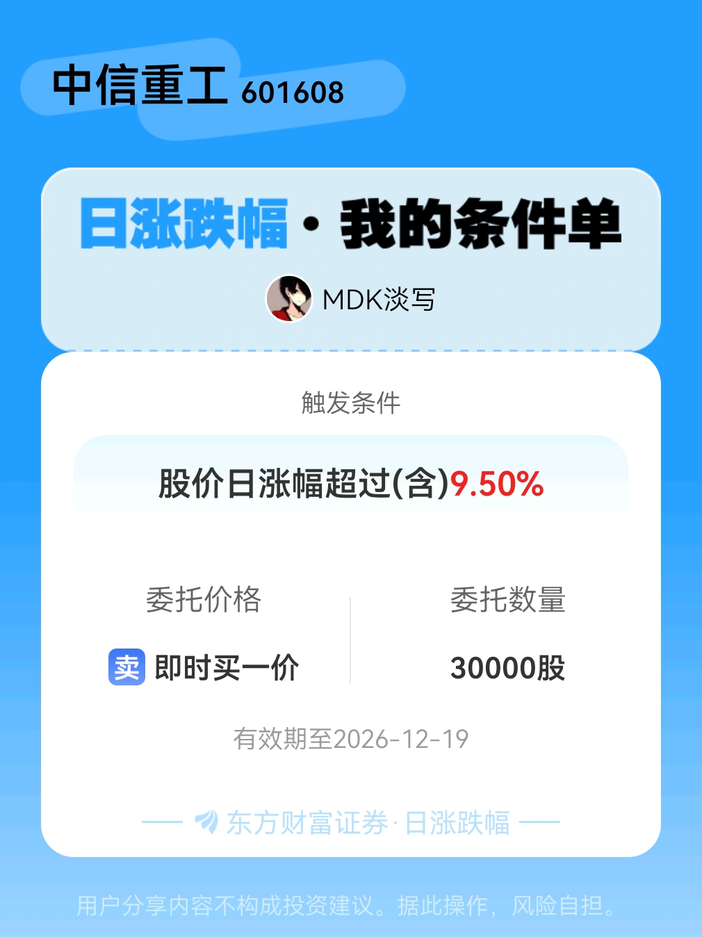 #条件单交流# #日涨跌幅晒单# 一位股神设置了一个日涨跌幅条件单,接下来就是见证奇迹的时刻~$中信重工(SH601608)$