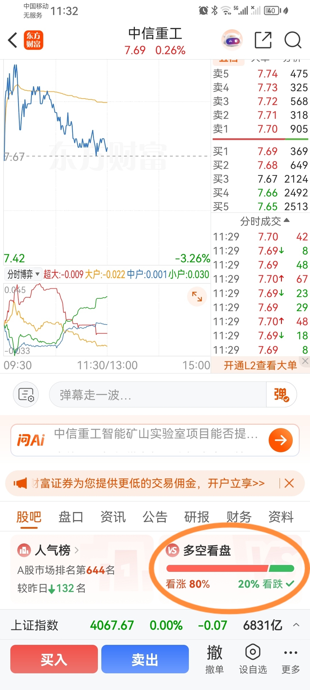 $中信重工(SH601608)$ 前天一跌65%看空,第二天涨了5%,昨天一涨今天散户80%看多,好了吧冲高回落了,震荡市场是反着来的