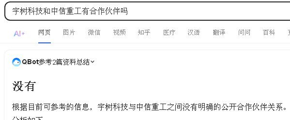QBot 搜索结果. 宇树科技与中信重工之间没有合作伙伴关系
