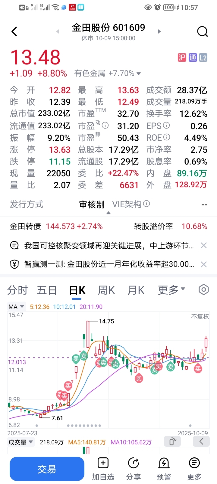 从上图可知,金田为我带来了第一波近四成的收益,中间近一个月的横盘震荡,我也小有收获,前天的低吸参与,三天收获14%。