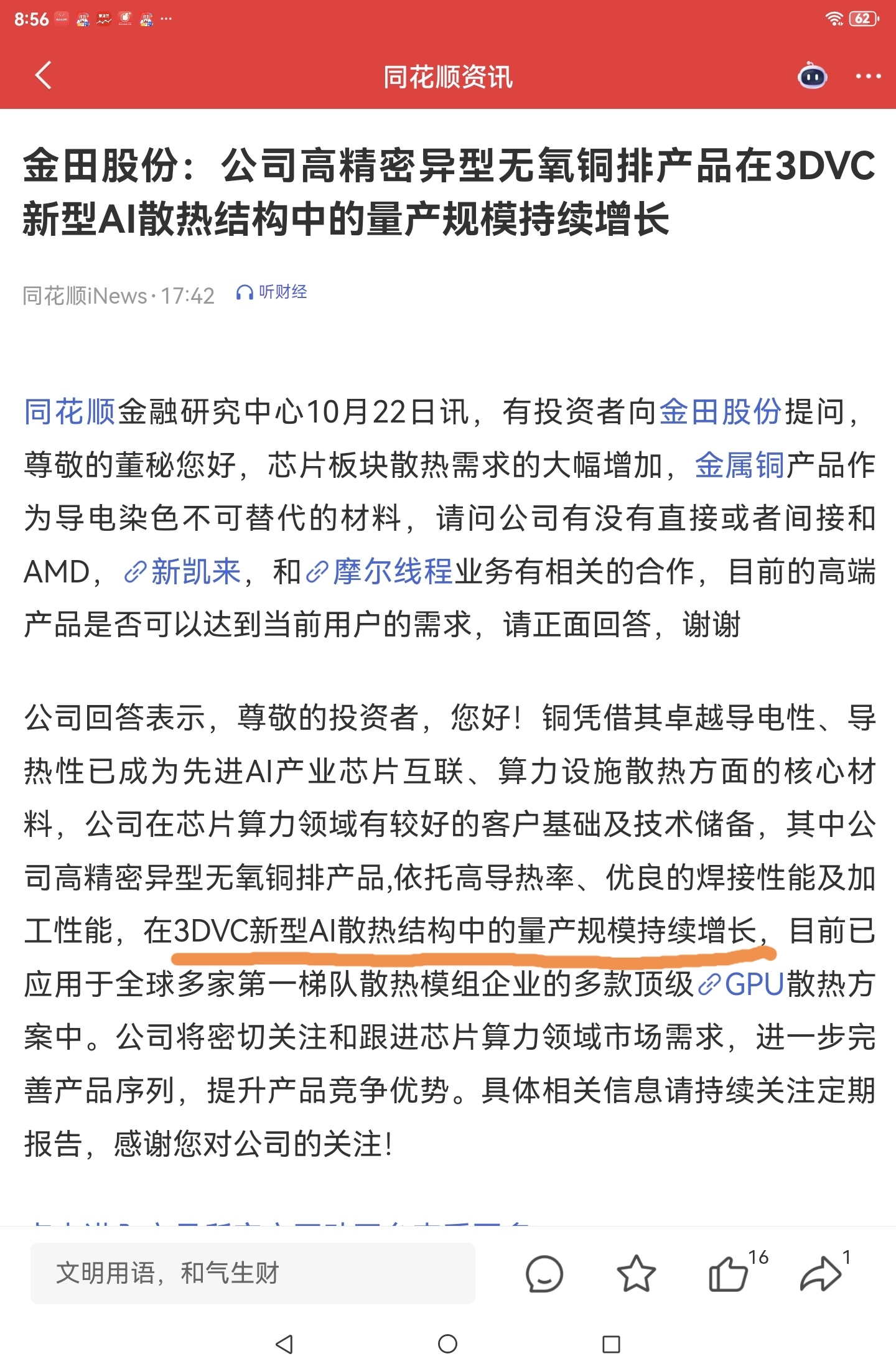$金田股份(SH601609)$ 各位董秘今天的回复与三季报前十月十六日的回复是否不一样,十月十六日的回复是公司高精密无氧铜排己成功在3DVC新型散热结构中规模量产,今天的回复是公司高精密铜排产品在3DVC新型散热结构中的量产规模持续增长,几个字之差表述内容完全不一样,请仔细品品!