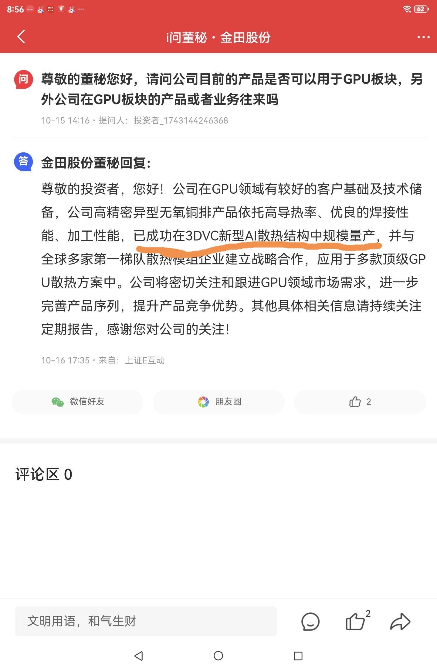 $金田股份(SH601609)$ 各位董秘今天的回复与三季报前十月十六日的回复是否不一样,十月十六日的回复是公司高精密无氧铜排己成功在3DVC新型散热结构中规模量产,今天的回复是公司高精密铜排产品在3DVC新型散热结构中的量产规模持续增长,几个字之差表述内容完全不一样,请仔细品品!