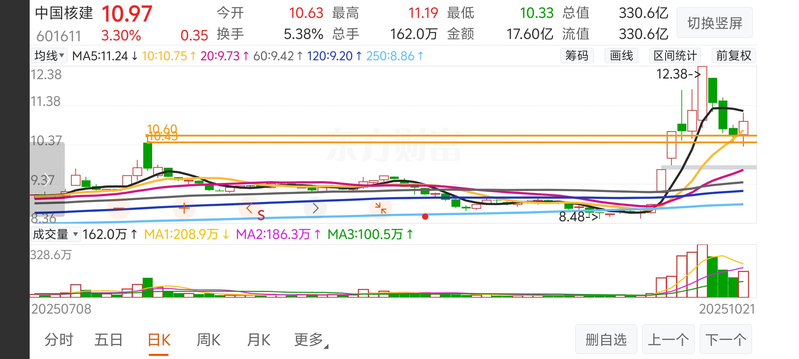 $中国核建(SH601611)$ 突破后的回踩。今日量价双胜阳盖阴,静待花开!