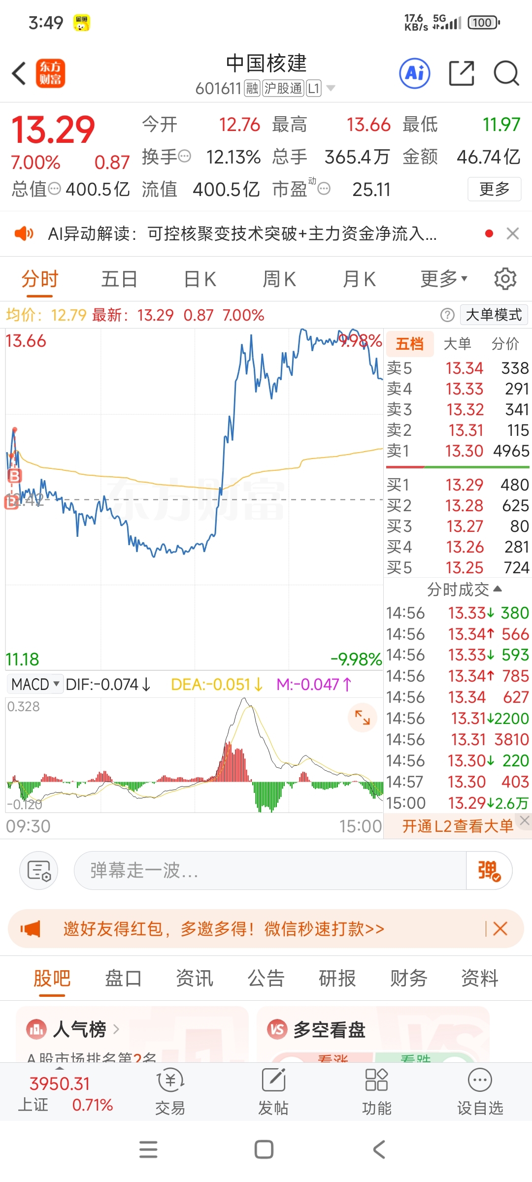 $中国核建(SH601611)$ 周五复盘,昨天追高的桂发祥,今日水下开盘果断清仓。清仓之后立马满仓加入中国核建,虽然今天还是盈利,但是还是太着急,因为我怕它秒板,总体来说今天操作还是差了一点,悟道之路任重而道远。