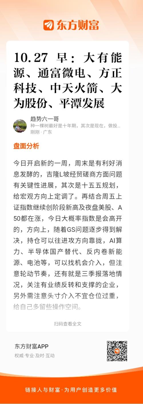 今日开启新的一周,周末是有利好消息发酵的,吉隆L坡经贸磋商方面问题有关键性进展,其次是十五五规划,给宏观方向上定调了。再结合周五上证指数继续创阶段新高及夜盘美股、A50都在涨,今日大概率指数是会高开的,方向上,随着GS问题逐步得到解决,持仓可以往进攻方向靠拢,AI算力、半导体国产替代、反内卷新能源、电池等,可以找机会介入,但注意轮动节奏,还有就是三季报落地情况,关注有业绩反转和支撑的企业,另外需注意头寸介入不宜仓位过重,给自己多留些操作空间。