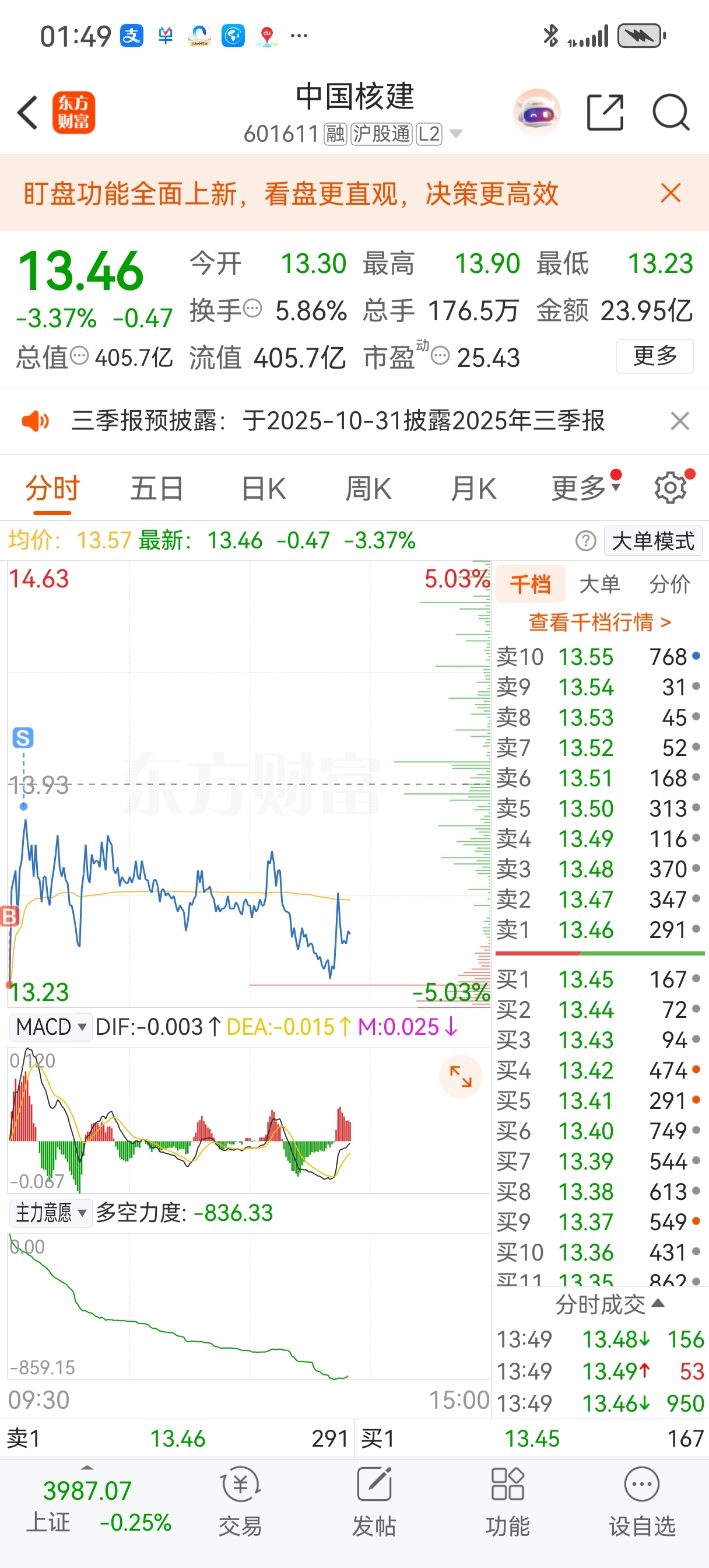 $中国核建(SH601611)$ 今天占时出在最高点