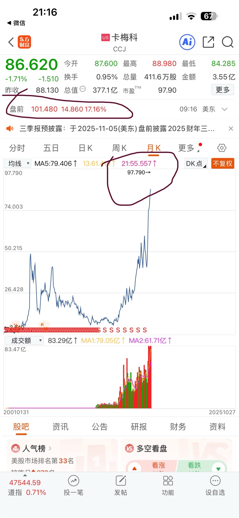 漂亮国:卡梅科盘前大涨17%,创历史新高,中国核建今天你被洗下车了吗?$中国核建(SH601611)$$卡梅科(NYSE|CCJ)$
