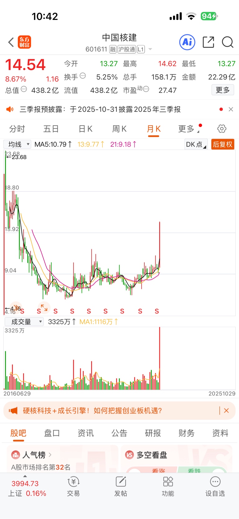 中国核建距创新高还有60%,不要被洗盘甩下车。$中国核建(SH601611)$