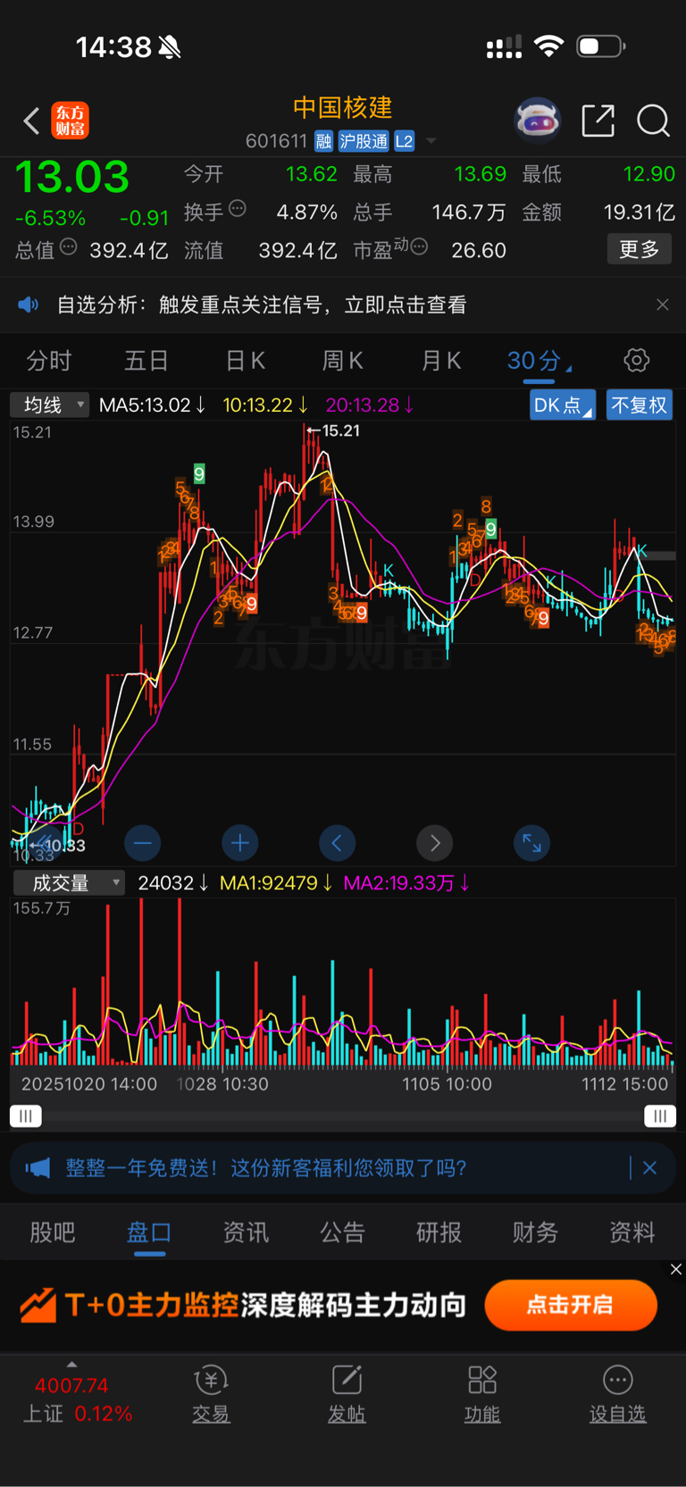 $中国核建(SH601611)$ 30分钟级别这个箱体有点意思,刀刀见血又波澜不兴,降仓位不甘心,总觉得还得有一波上冲,加仓位置又一直不给好的买点,然后操盘的就左手融资右手融券当兔子,狗是真狗,继续看戏吧