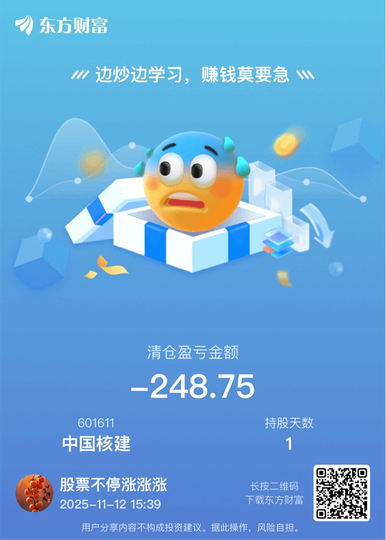 $中国核建(SH601611)$ 票是昨天收盘追的,肉是今天早上开盘割的,我真是韭菜盒子一个,求兄弟们安慰