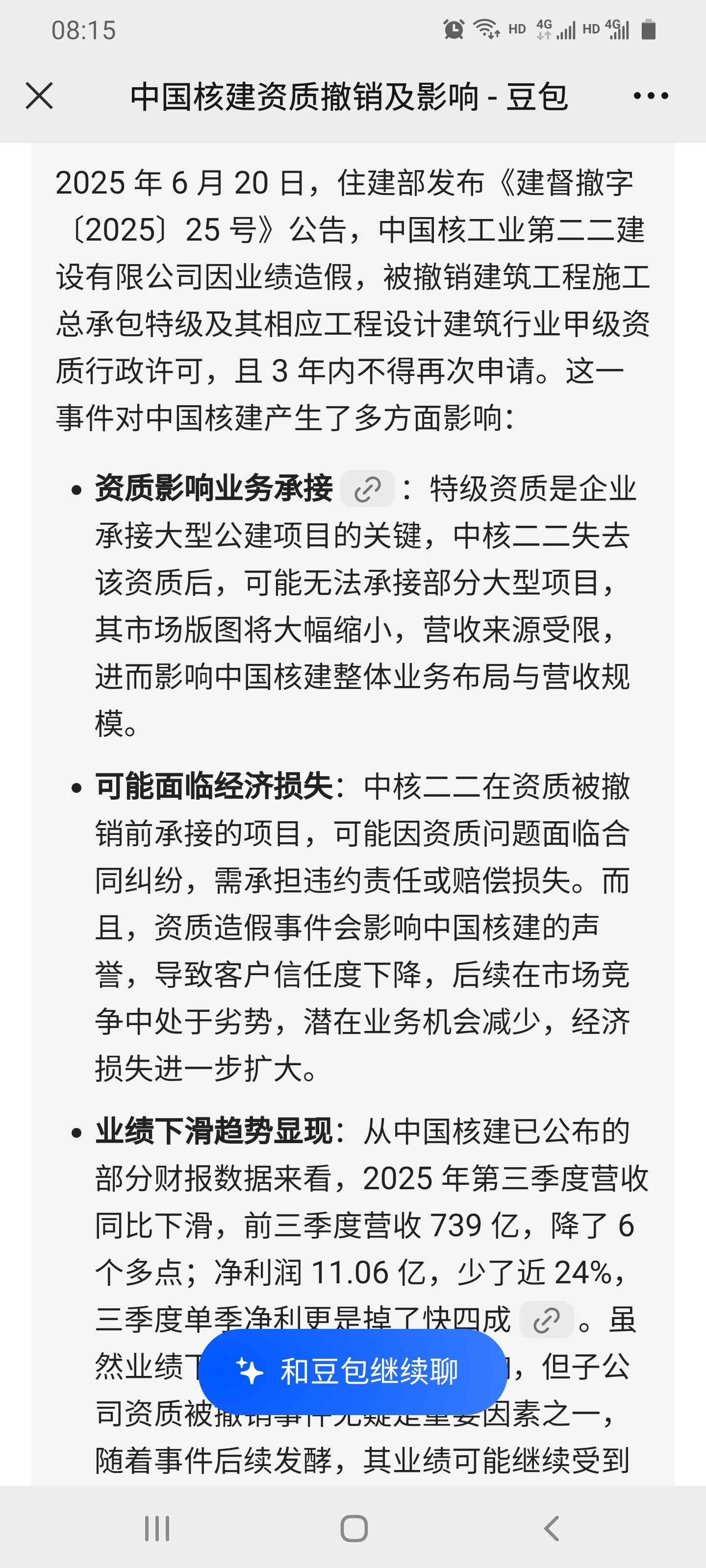 中国核建在出货了,子公司核二二公司被取消了国家级资质,且三年内不能再取得,造成中国核建的业绩持续下滑,途中被取消前的项目,也需要赔钱。虽然是6月20号的事,但项目的后续问题在发酵中