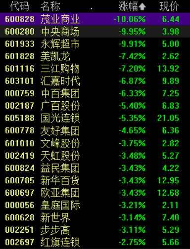 零售板块调整,茂业商业、中央商场、永辉超市跌停。