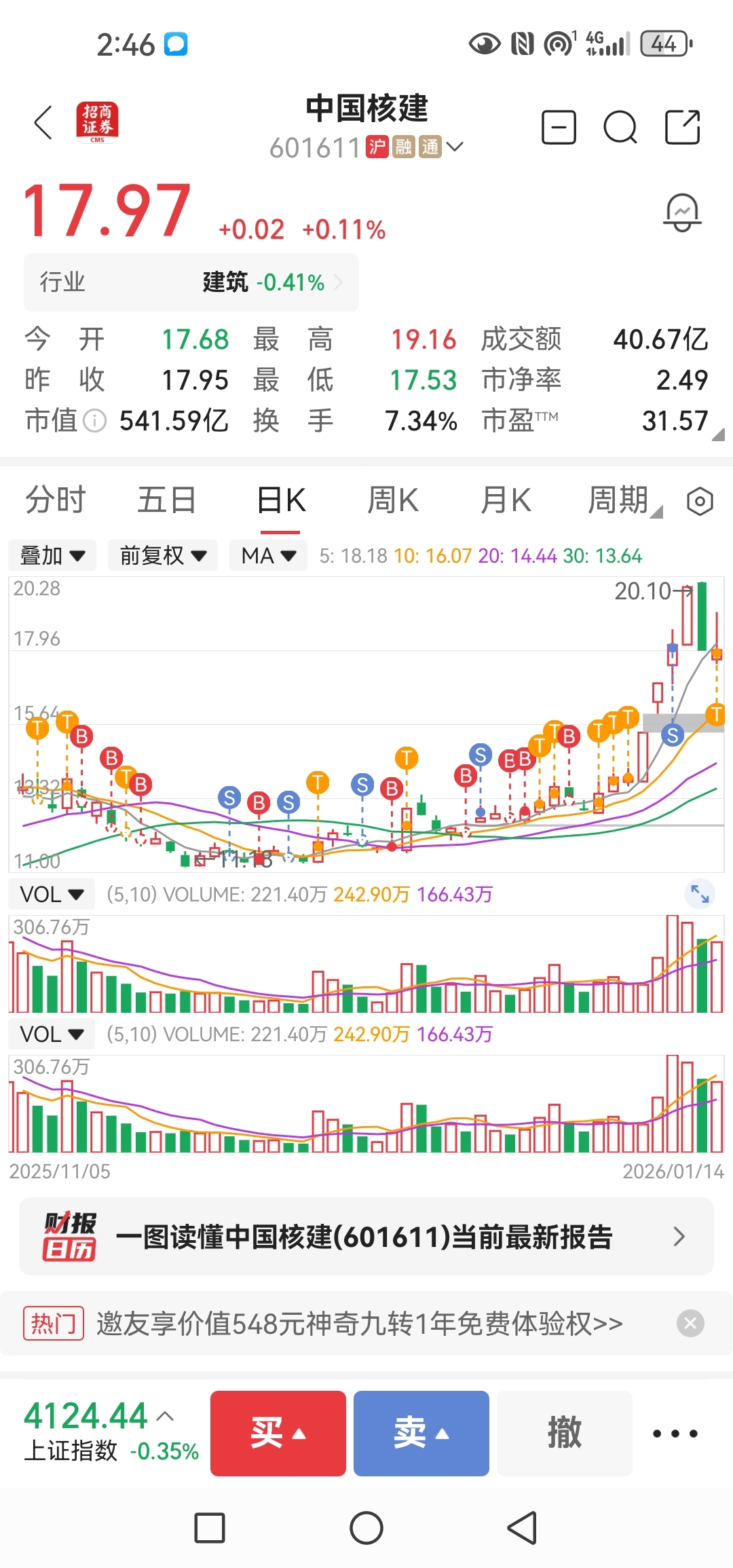 $中国核建(SH601611)$ 兄弟们,我出来冒个泡,我还在,今天我又做了个小 t,我还有260手,成本价8.36,我的目标是做到负数。没啥可慌的,这个股赞我6成仓,我会一直陪着你们