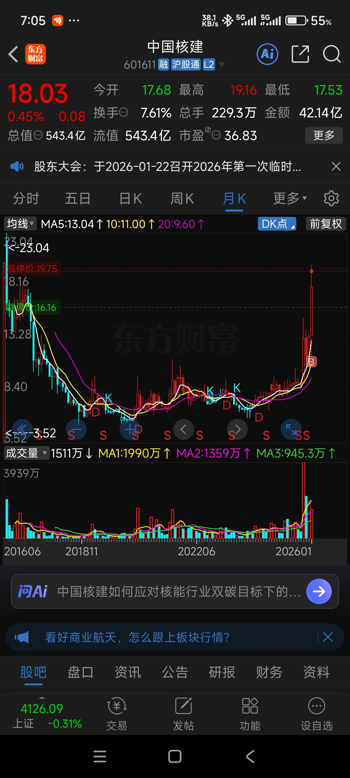 $中国核建(SH601611)$ 不出手则已,一出手必须最高点,遥想上次还是17年的这个时候