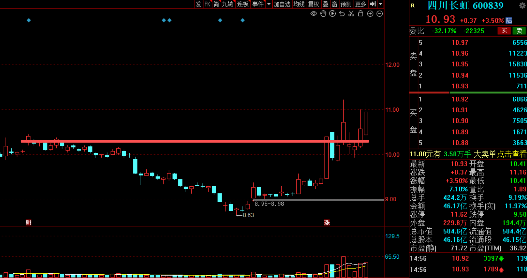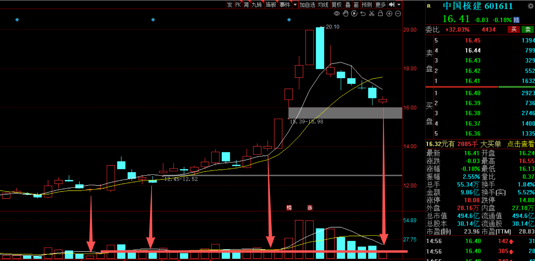 地量地价本轮上涨以来9亿就是一个地量,前面来看,成交回到9亿附近就有新的资金进场了。目前股价回到缺口支撑附近了,缺口支撑也还有,目前市场是大轮动,只要不回补下方15.39-15.98缺口就还可以守,昨天地量今天存在弱转强预期。