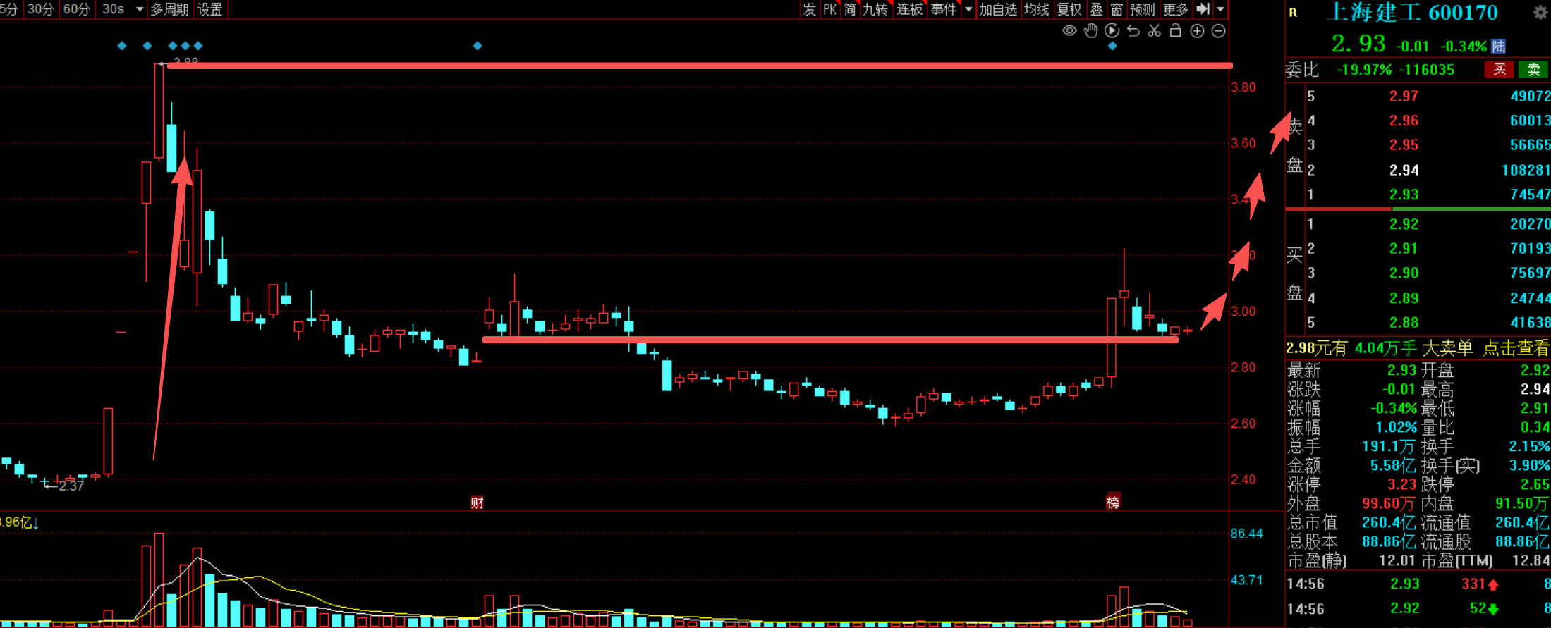 建工横盘震荡6个交易日,昨天出十字属于中继整理末端了,建工前期去年9月份有5连板,有三个板是换手板,只有一个头部,主力资金出货是不充分的,所以必然会有二次拉升甩货。目前第一个板启动在酝酿二次启动,当前位置就是绝佳潜伏点位,等待主力拉升出货我们跟随主力出货就行。