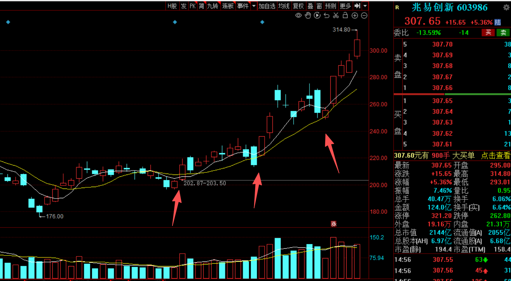 昨天出中阳线突破300整数大关,五连阳持续创新高,很多跟随老猫一起拿过的朋友都比较担忧了。对于创新高的股我就两个持股标准,第一不能放倍量,只要不放倍量资金就没有分歧,第二上升趋势线不跌破都是安全的,其他的不要去看,市场上有很多文章观点会动摇你的持股信心,人性本来就是畏高的,而且大多数散户交易习惯不好,亏钱可以一直扛,但挣钱就守不住。兆易是本轮存储芯片制造的核心龙头,业绩还没有发布,在业绩发布前都存在业绩预期差的机会。