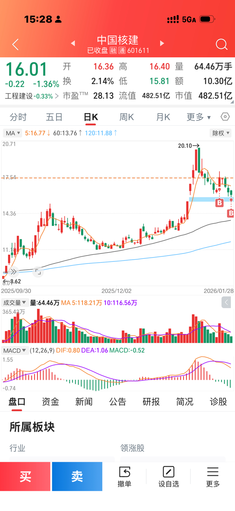 $中国核建(SH601611)$ 周一早上完全是有盈利可以跑的,可惜还是贪了没跑,现在好了短线玩成了长线只能通过做 t 降成本了